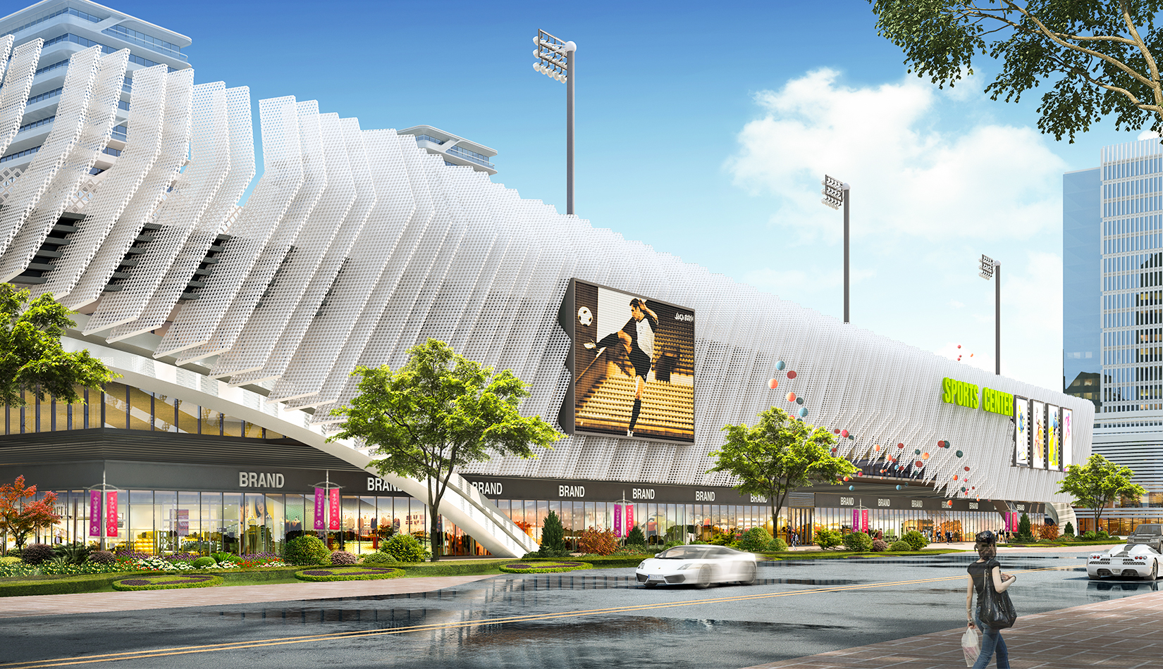本項(xiàng)目提取高鐵動(dòng)車和海浪浪花的概念,用白色鋁板陣列與變化塑造出體育綜合體泛著浪花的海洋波浪造型。同時(shí)利用動(dòng)車動(dòng)感流線的造型設(shè)計(jì)出公寓的整體方案。海浪與動(dòng)車流線結(jié)合,不僅代表了青島的特色,更是詮釋了積極動(dòng)感的體育精神。將景觀引入建筑,以景觀打造形象,形成未來(lái)綜合體發(fā)展模式。